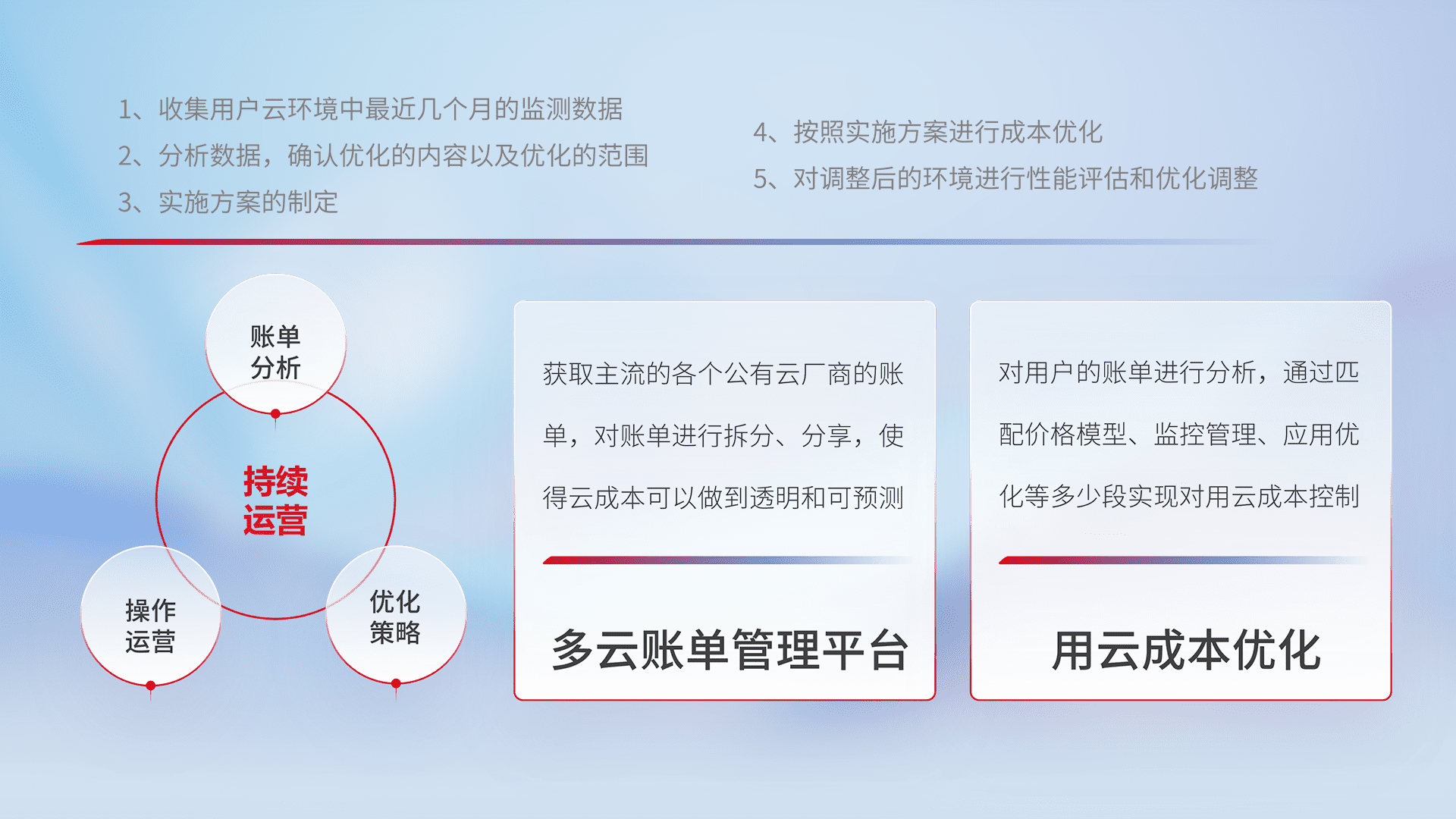 通过多云纳管,,以统一的资源数据模型把客户的云资源进行抽象和封装,,,,进而实现对多云资源的统一操作,,,保障云资源管理的可靠性、、稳定性与可用性。。。量身定制化运维内容,,,,配置、、开发运维、、补丁管理、、、备份、、、监控、、、、认证和访问管理、、、、审计和日常巡检等,,保障在用云过程中的可靠度,,,稳定度以及高可用率。。。。